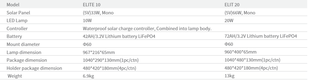 • Monocrystalline Solar Panel • High Efficiency Controller • Lithium Battery LifeP04 • Led Chip • Integrated Design • Up to Level 13 typhoon Resistance • Custom Design Light Controller • IP65
